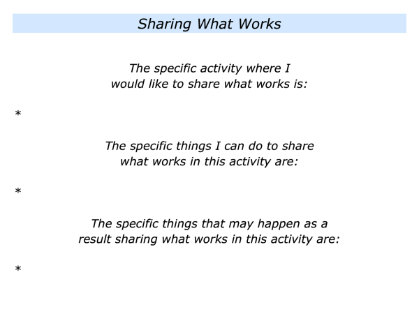 If you wish, try tackling the final exercise on this theme. This invites you to describe the specific things you can do to share what works with people. Here is the exercise.