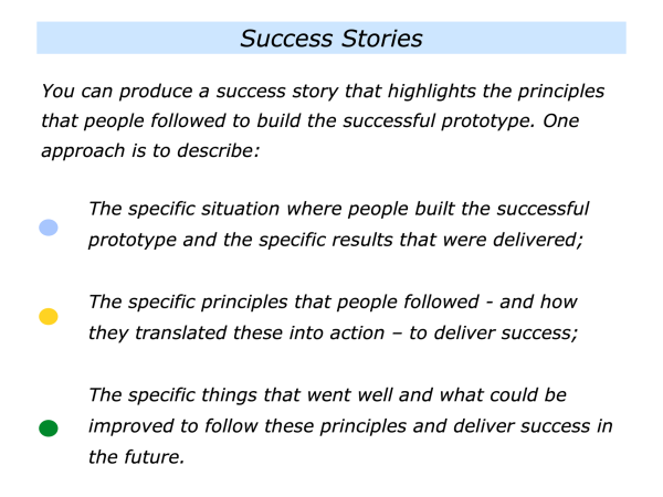 This is to follow certain principles to build successful prototypes and produce success stories.