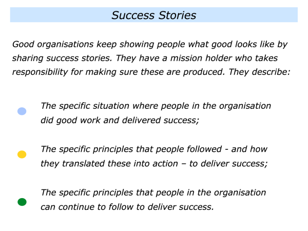 There are many ways to show rather than just tell when building and maintaining an organisational culture. One approach is to keep producing success stories. These can encourage people to keep following the principles for achieving success.