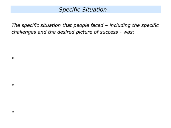 People could be helping a client, solving a problem, making systems work better or whatever. It is to describe the challenges they faced and the desired picture of success.