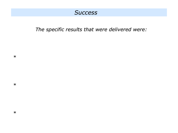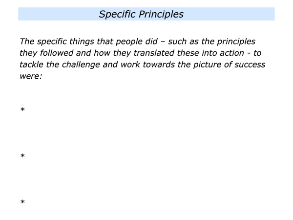 The next step is to describe the strategies – such as the principles – that people followed and how they translated these into action. It is then to describe the results that were delivered to achieve the picture of success. Plus it can be good to summarise what was learned from the experience. .