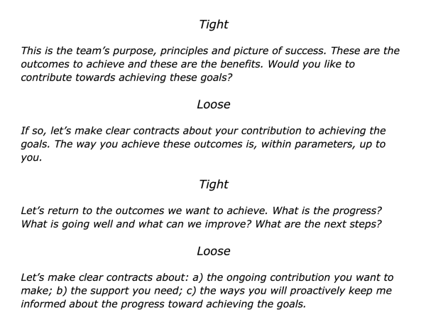 People who take this approach often aim to manage by outcomes rather than by tasks. They focus on the Tight-Loose themes and explain these by saying something along the following lines to their people.