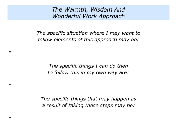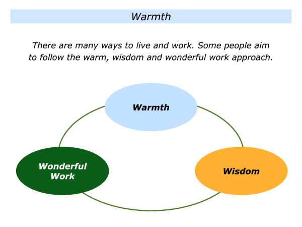 There are many ways to live and work. Some people aim to follow the warmth, wisdom and wonderful work approach. They may do this in the following ways.