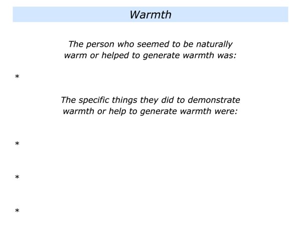 What was the name of the person? This could have been a parent, friend, teacher, coach or another person. What did they do to demonstrate warmth or help to generate warmth?