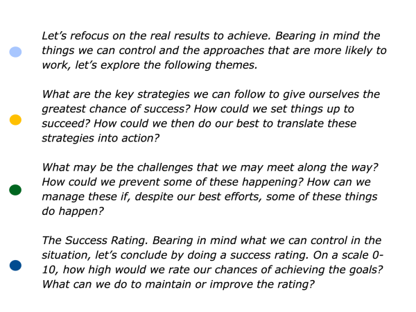 The leader will aim to clarify the goals to achieve in the short, medium and long-term. Bearing in mind what they can control in the situation, they may explore the following themes.