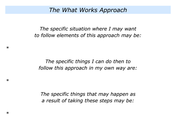 Let’s return to your own life. Looking ahead, can you think of a situation where you want to follow elements of the what works approach? How can you follow this in your own way?